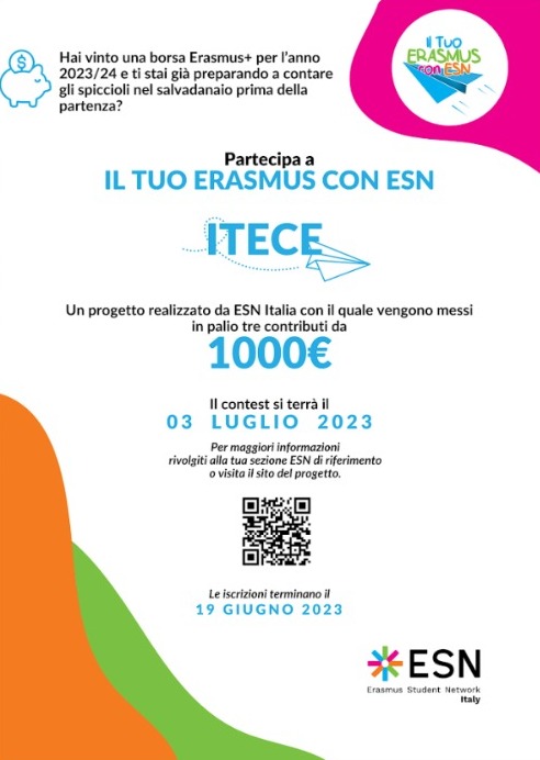 Il Contest ‘’Il Tuo Erasmus con ESN’’, giunto alla nona edizione, è uno dei progetti più importanti di ESN Italia ed ha l’obiettivo di fornire un ulteriore sostegno economico - che andrà a sommarsi a quello regolarmente erogato dalle università e dall'Unione Europea - agli studenti iscritti ad un Ateneo italiano in possesso della “Erasmus Charter for Higher Education” (ECHE) che sono risultati vincitori di una borsa Erasmus+ e/o di una borsa di mobilità per l’anno accademico 2023/2024.